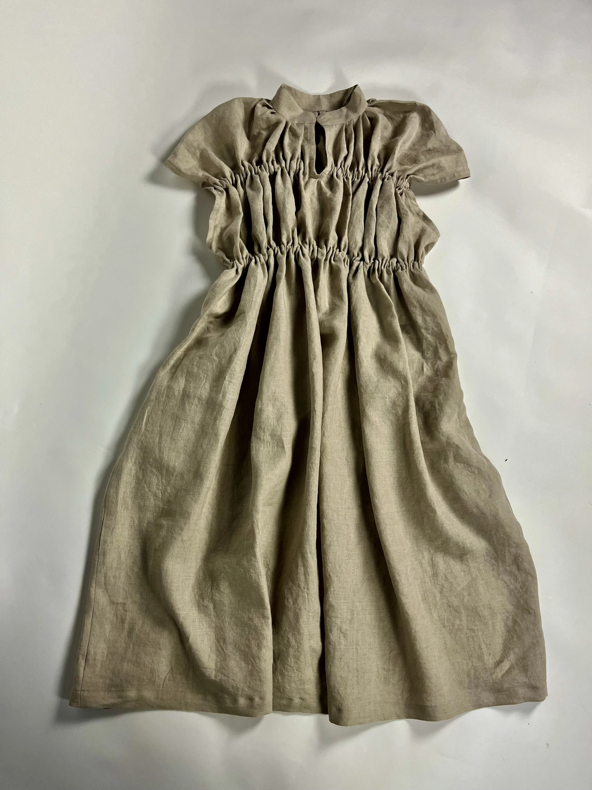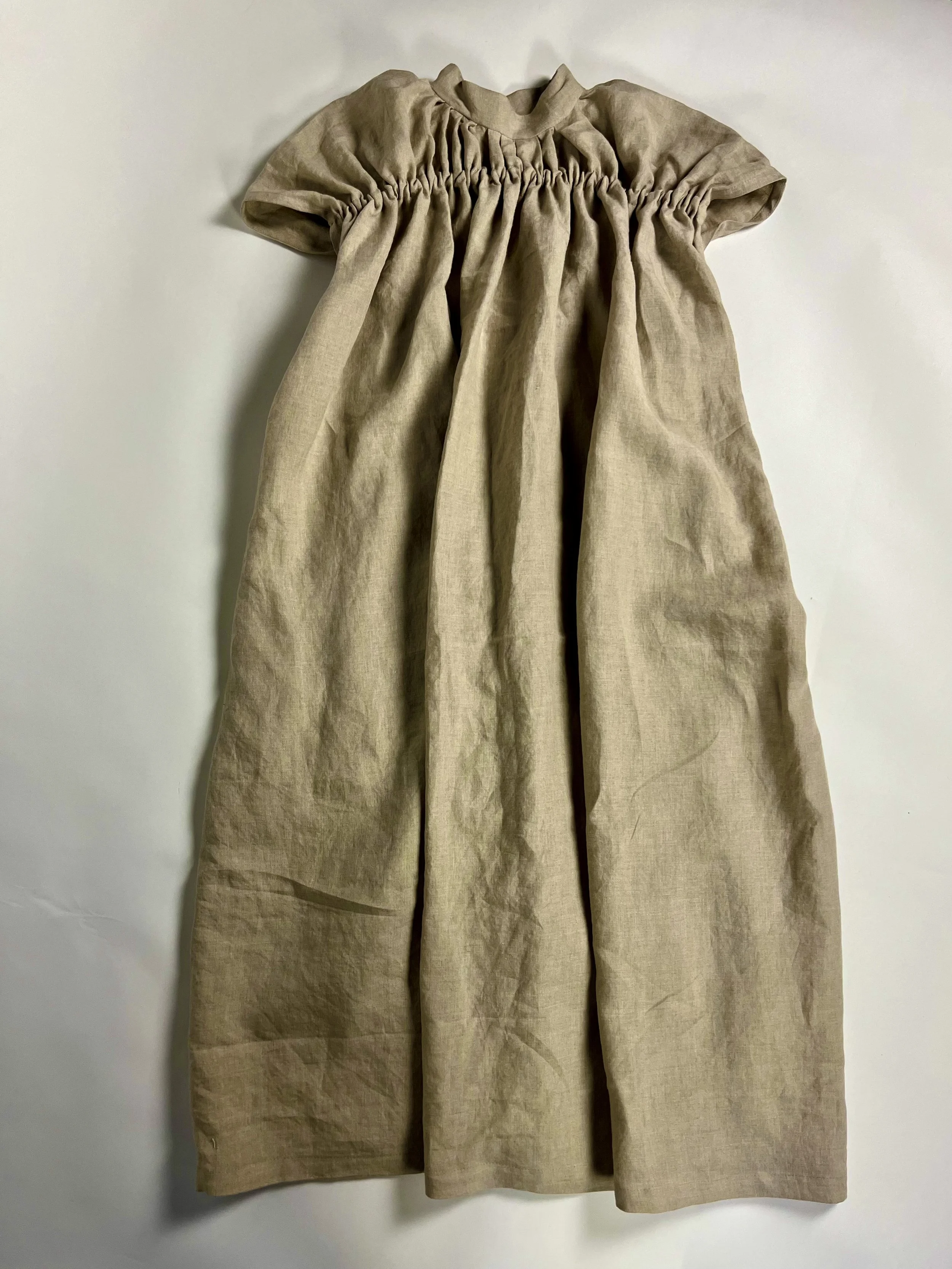 Cruinnigh - shown in Natural - $495 - Irish linen cap sleeve dress with front and back gathering details, side seam pockets