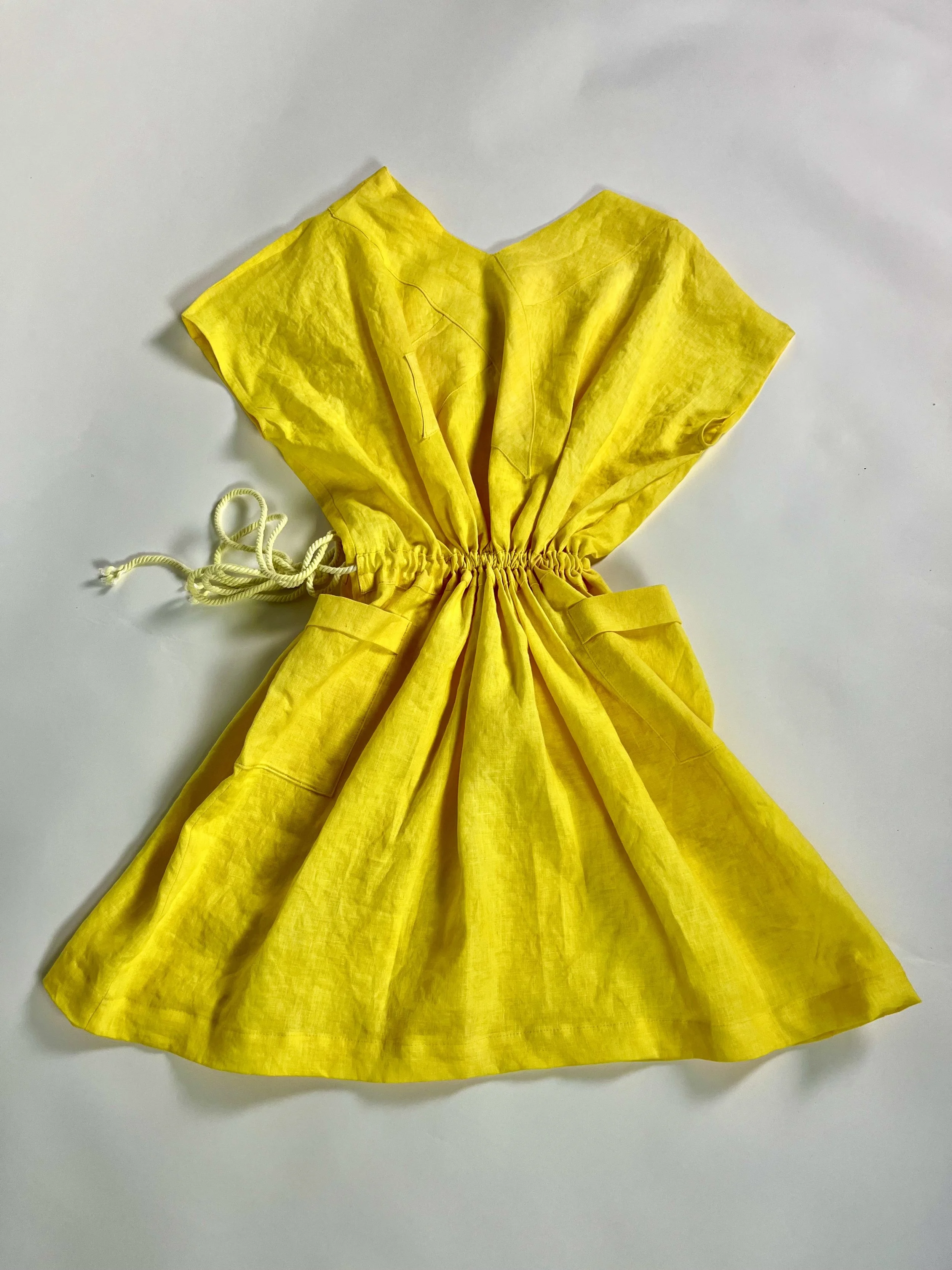 Banalra - shown in Yellow - $395 - Irish linen dress with patch pockets, drawstring waist and ribbon neck details