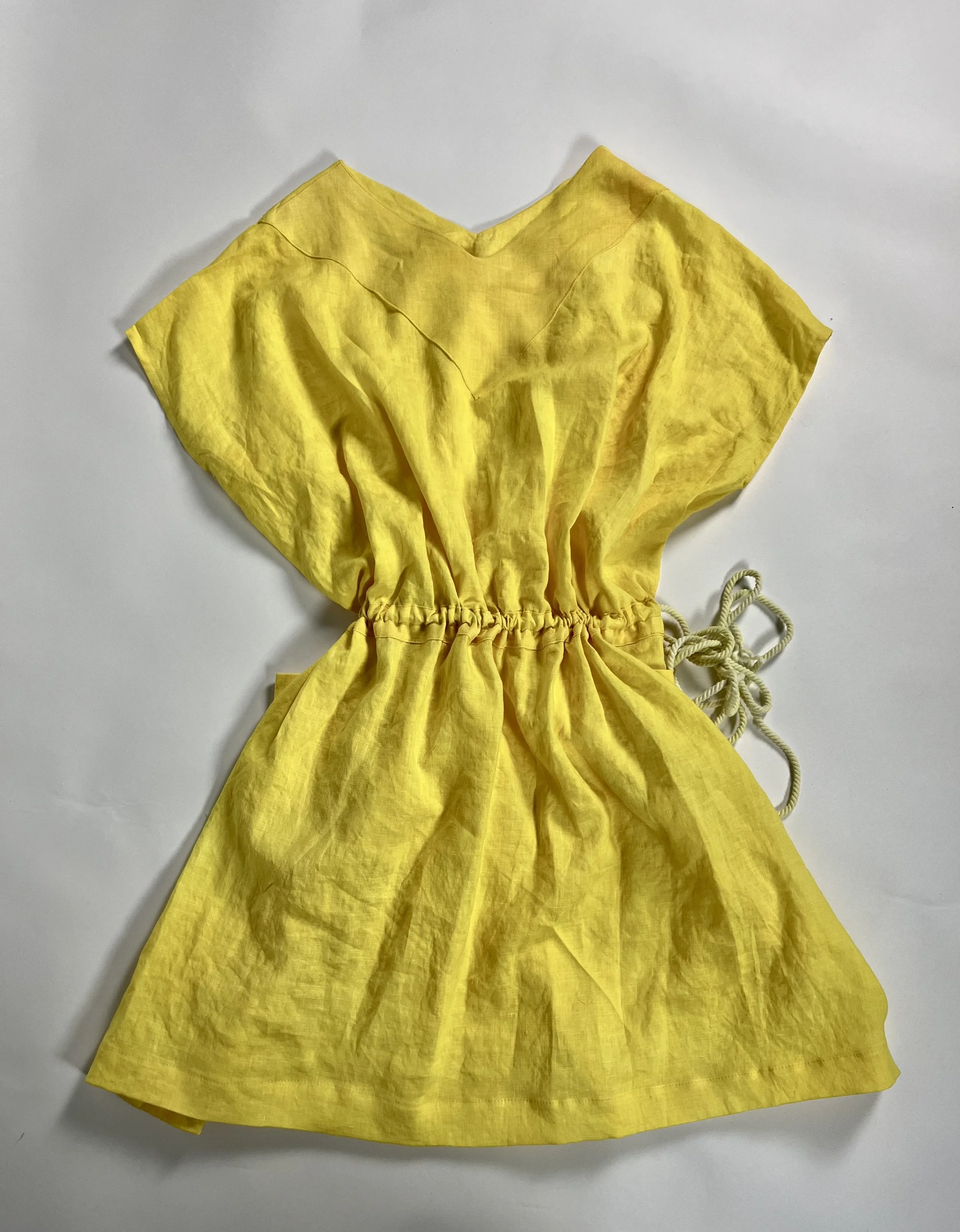 Banalra - shown in Yellow - $395 - Irish linen dress with patch pockets, drawstring waist and ribbon neck details.